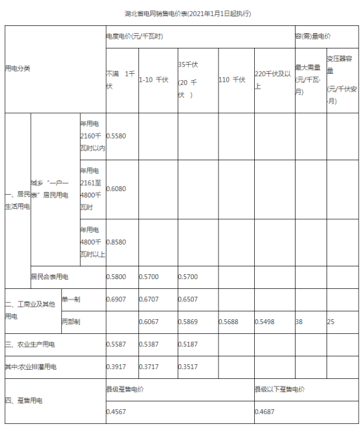 1、湖北电网用电容量在100千伏安及以上的工商业及其他用电(单一制和两部制)执行峰谷分时电价,商业用电和机关、部队、学校、医院、城市公共照明等非居民照明用电除外。